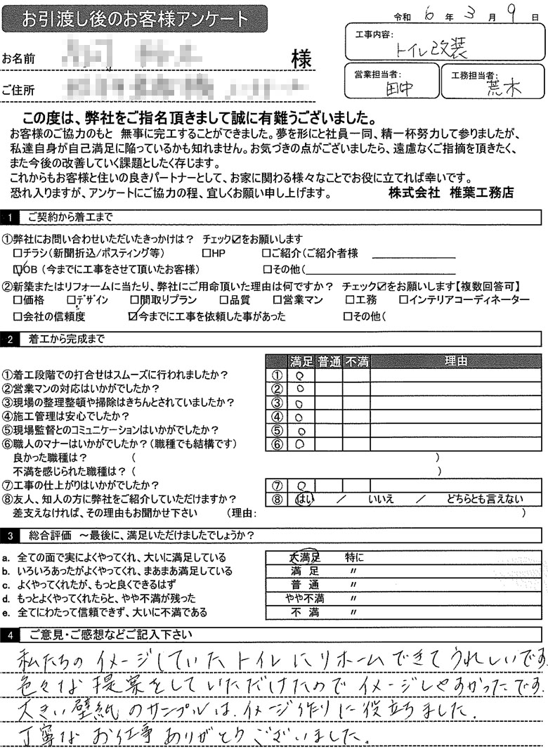 私たちのイメージしていたトイレにリフォームできてうれしいです。色々な提案をしていただけたのでイメージしやすかったです。大きい壁紙のサンプルは、イメージ作りに役立ちました。丁寧なお仕事ありがとうございました。